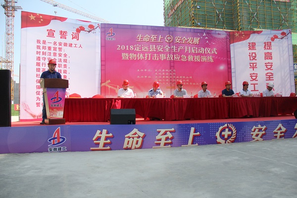 6月12日,定遠(yuǎn)縣在徽鹽曲陽現(xiàn)代城開展了以“生命至上,安全發(fā)展”為主題的2018年安全生產(chǎn)月啟動儀式暨物體打擊事故應(yīng)急救援演練活動??h直相關(guān)職能單位規(guī)建局、安監(jiān)局、公安局、衛(wèi)計委等負(fù)責(zé)人、徽鹽地產(chǎn)副總經(jīng)理黎元忠、徽鹽地產(chǎn)定遠(yuǎn)項目相關(guān)人員等出席了活動。